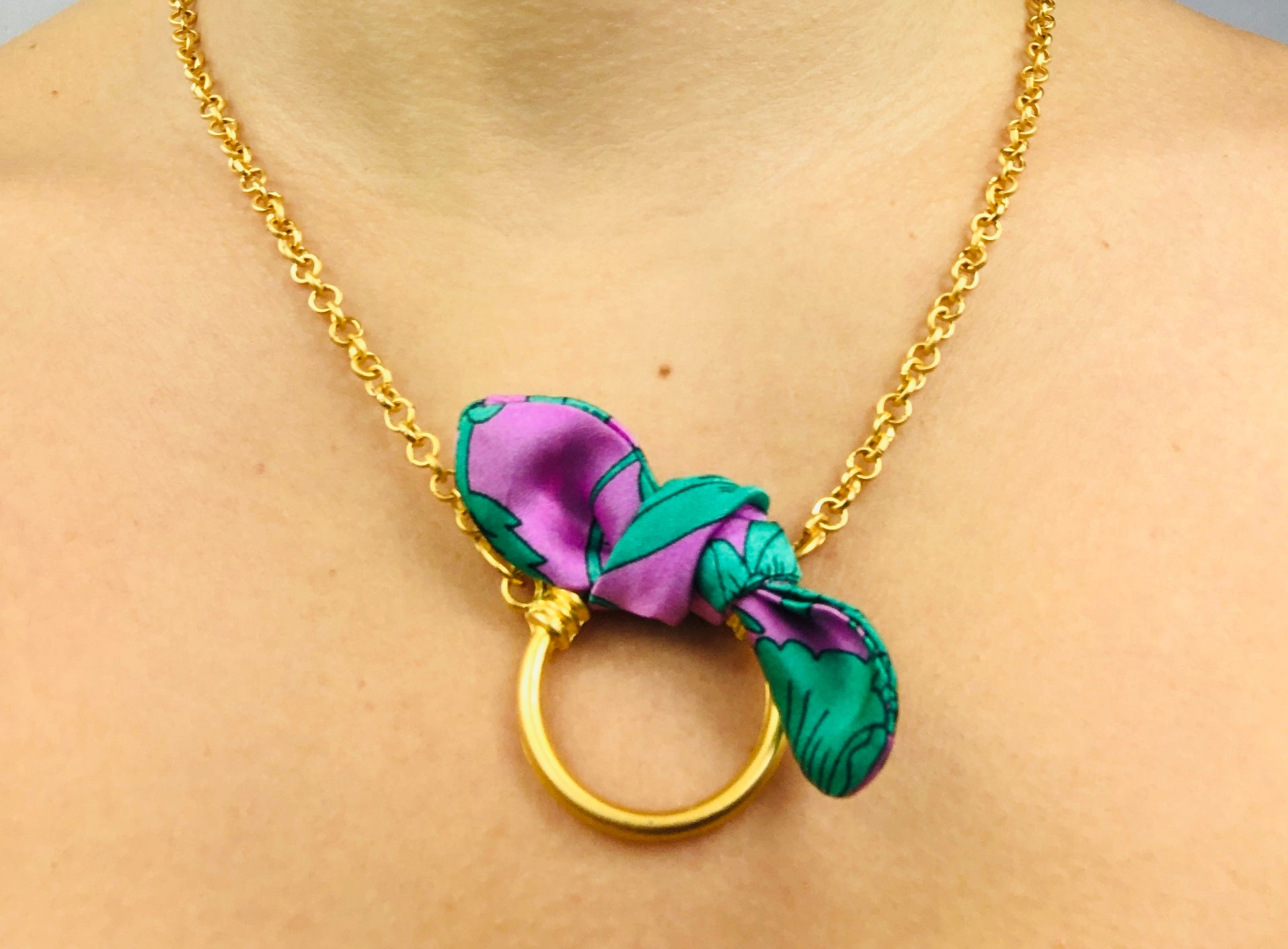 Introducing our elegant gold circle pendant necklace, a unique blend of elegance and individuality. This timeless necklace features a stunning Liberty print silk tie wrapped around a gold plated pendant. Each piece is handmade, ensuring its unique charm. Elevate your look with this elegant gold necklace, perfect for any occasion