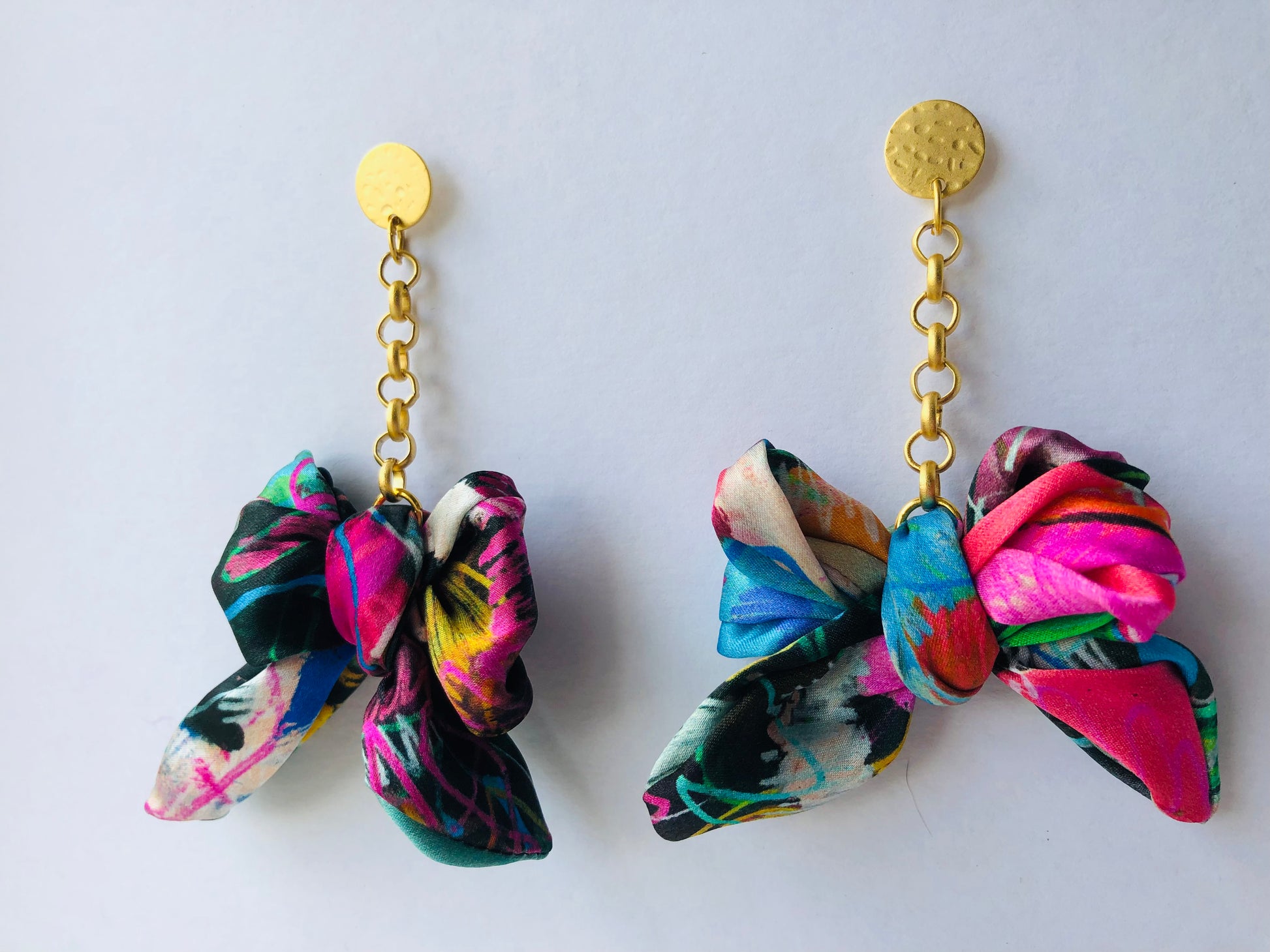 Looking to add some pop to your look? Dive into these playful bow earrings. Bold, colourful, and bursting with personality, these big earrings are the ultimate statement piece. Handmade from vibrant Liberty print silk, each pair is a unique addition to your jewelry collection. Elevate your look with these headturning fun and quirky earrings.