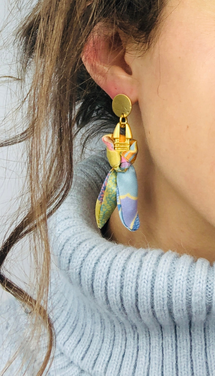 Introducing our Aztec Earrings: unique gold plated women's earrings featuring stunning Liberty London silk prints. These dangle earrings are the perfect blend of sophistication and individuality, offering a touch of elegance to any outfit.