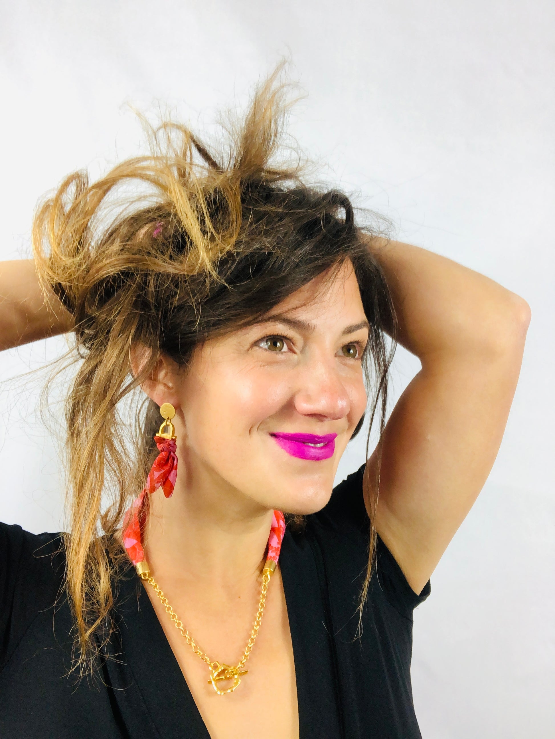 - Silk Sash Earrings featuring gold plated dangle earrings with a 100% Silk Sash in Liberty Print