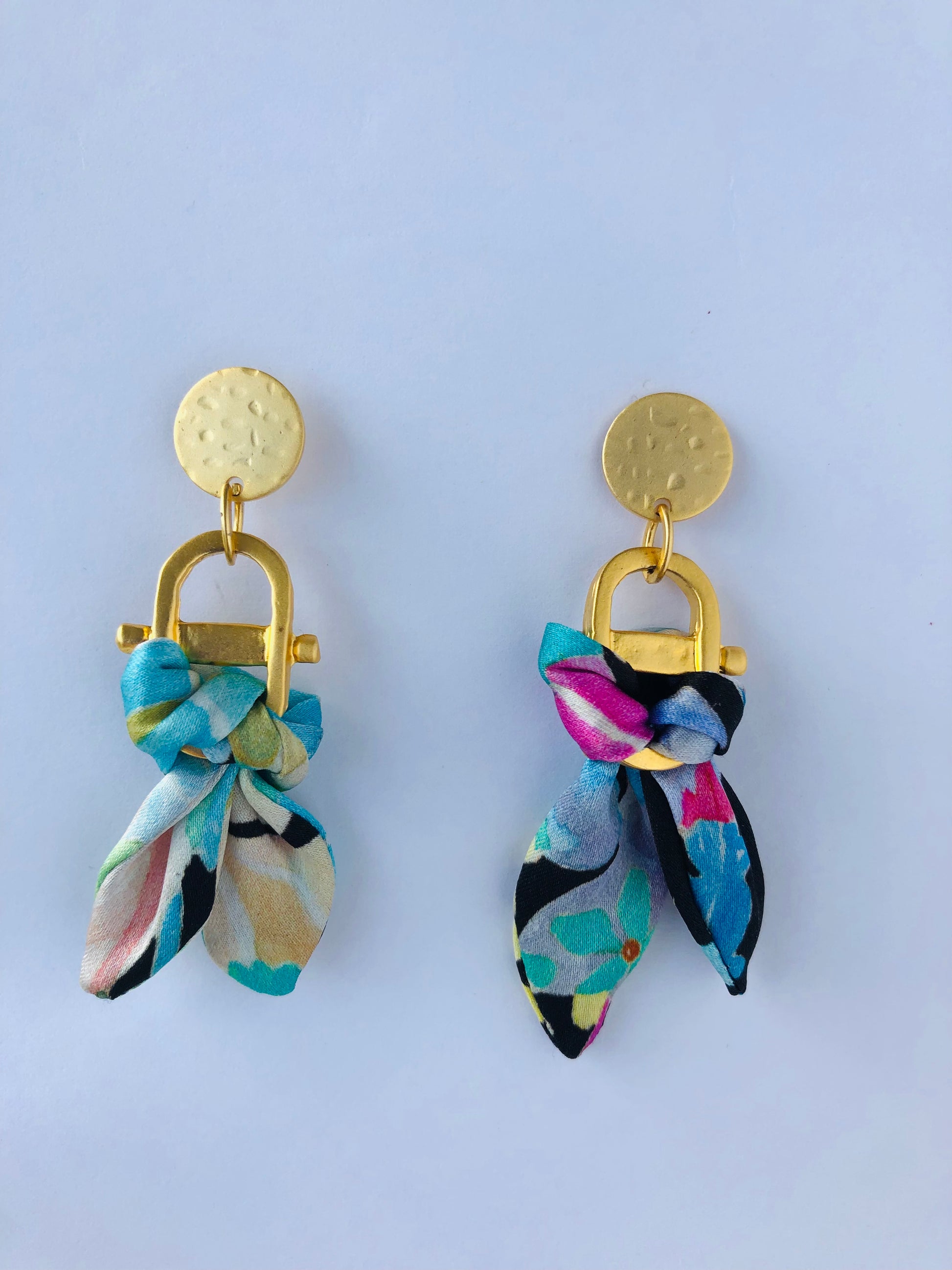 A beautiful and eye catching dangle earring featuring an elegant silk sash wrapped around a unique gold plated charm. Available in a variety of beautiful Liberty prints.