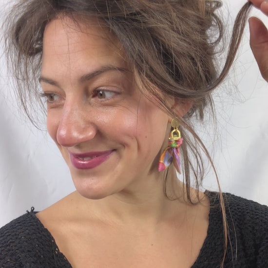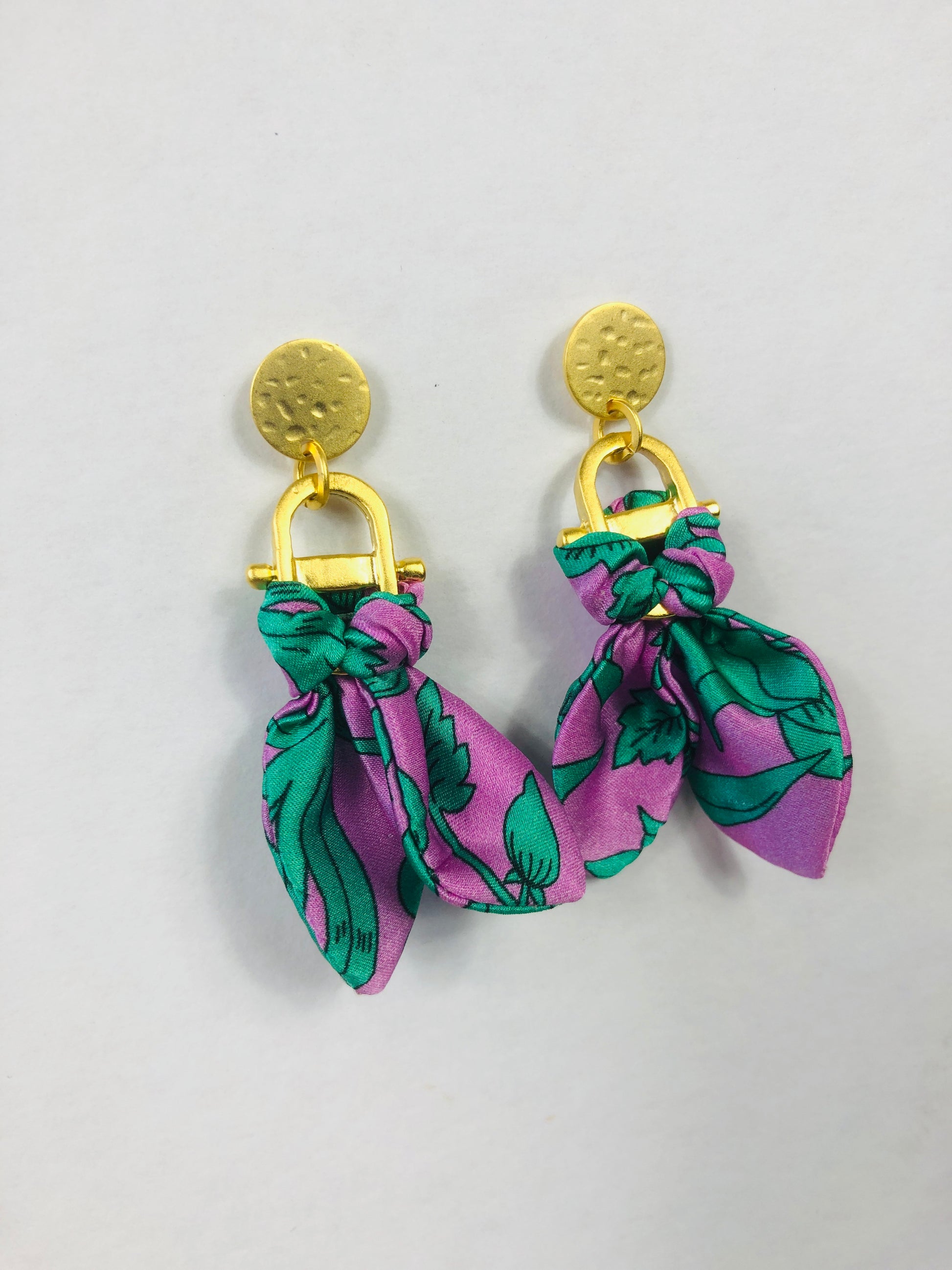 This beautiful and eye catching dangle earring features an elegant silk sash wrapped around a unique gold plated charm. Available in a variety of beautiful Liberty prints.